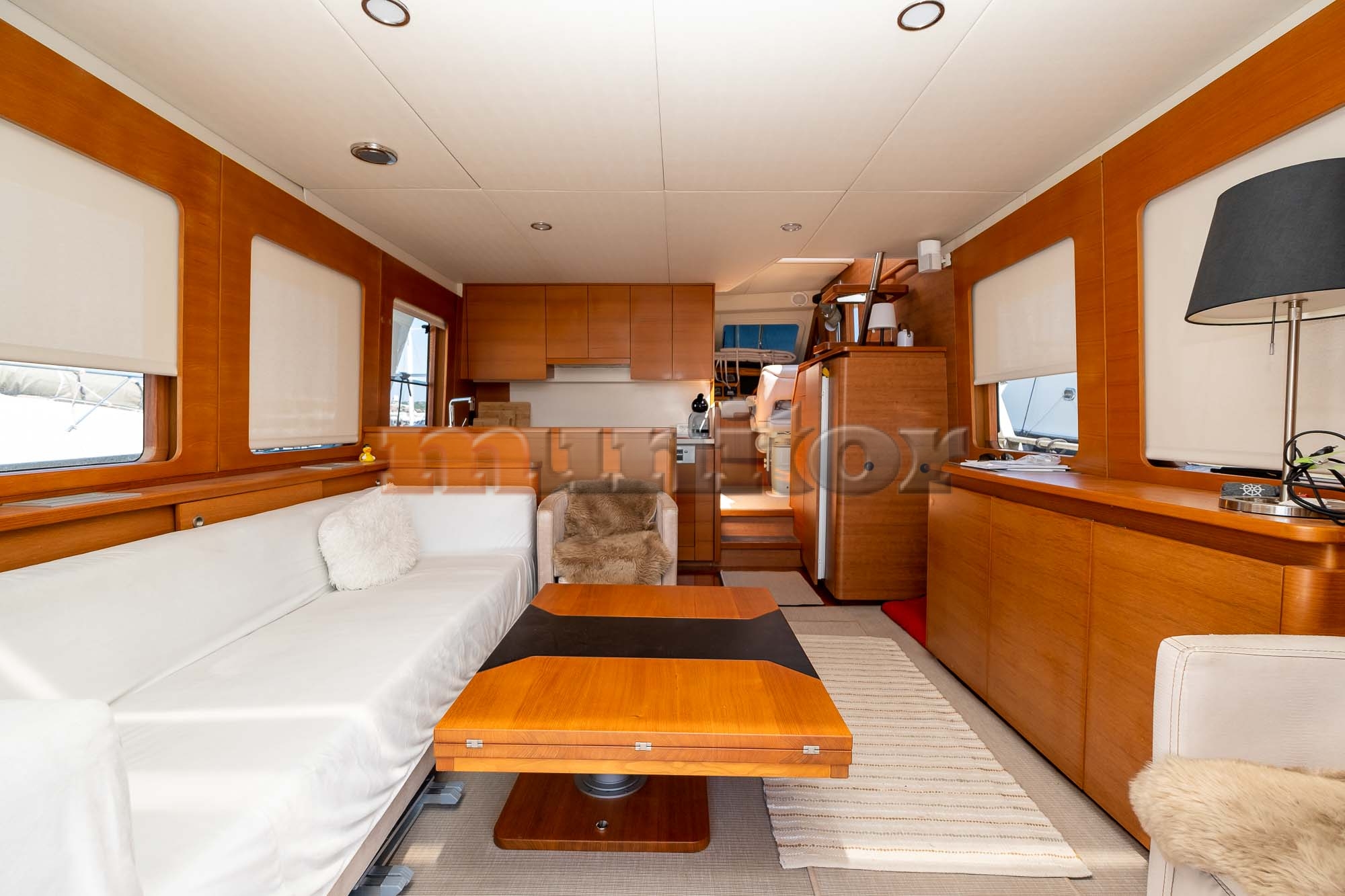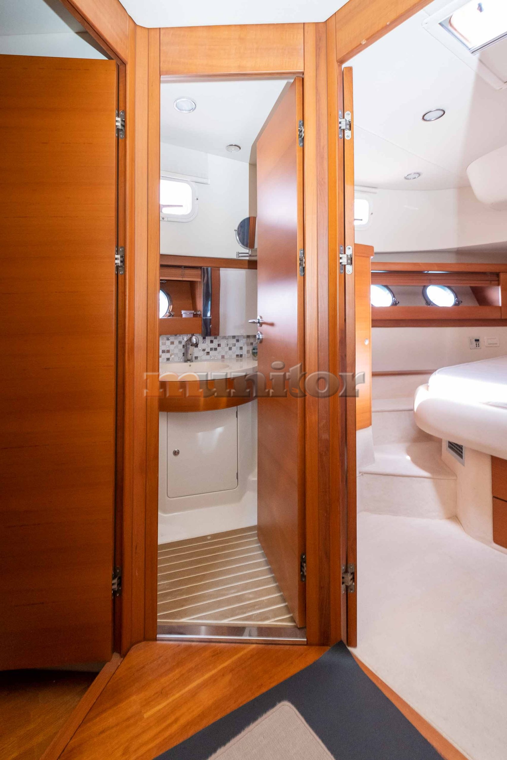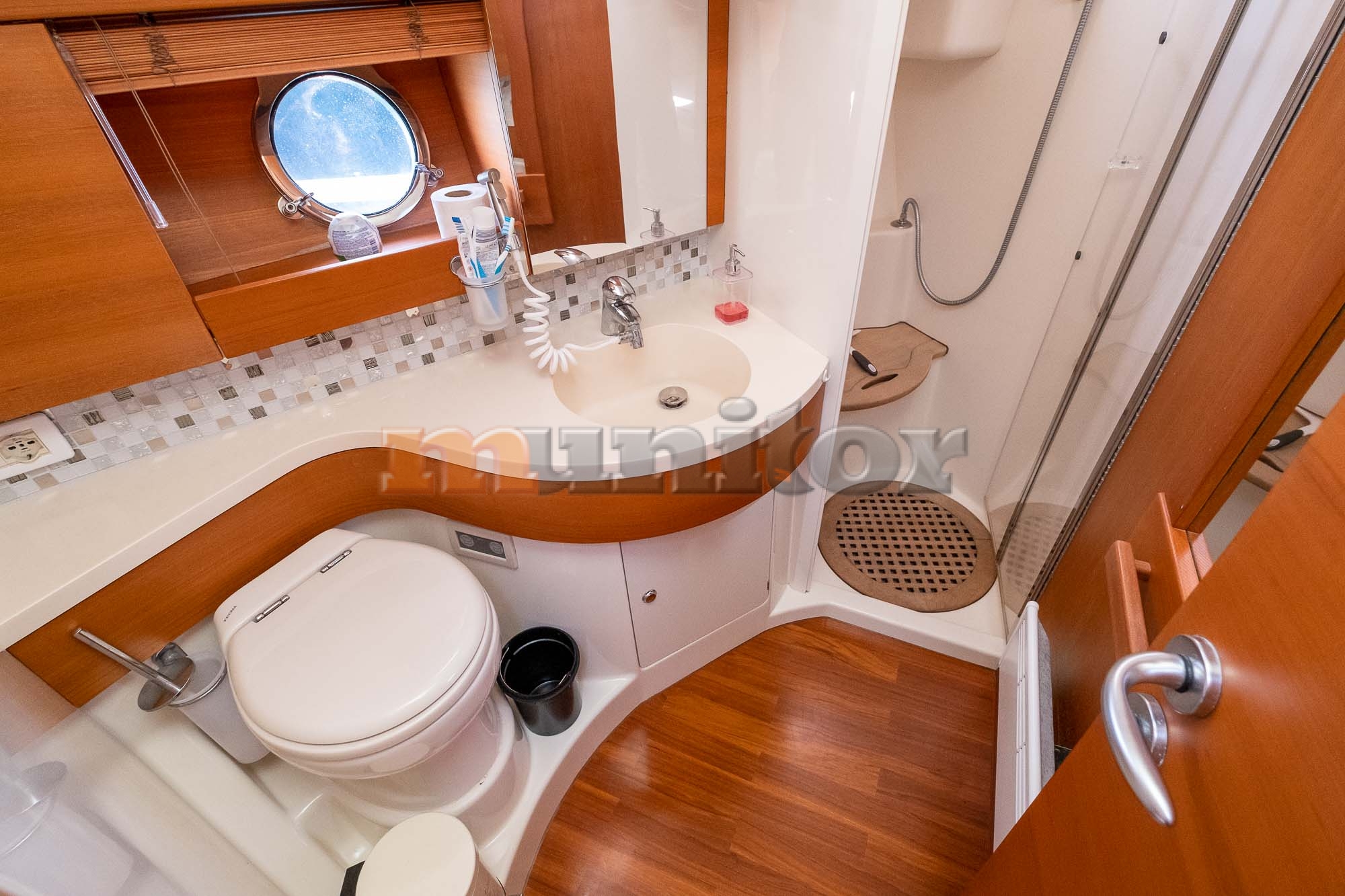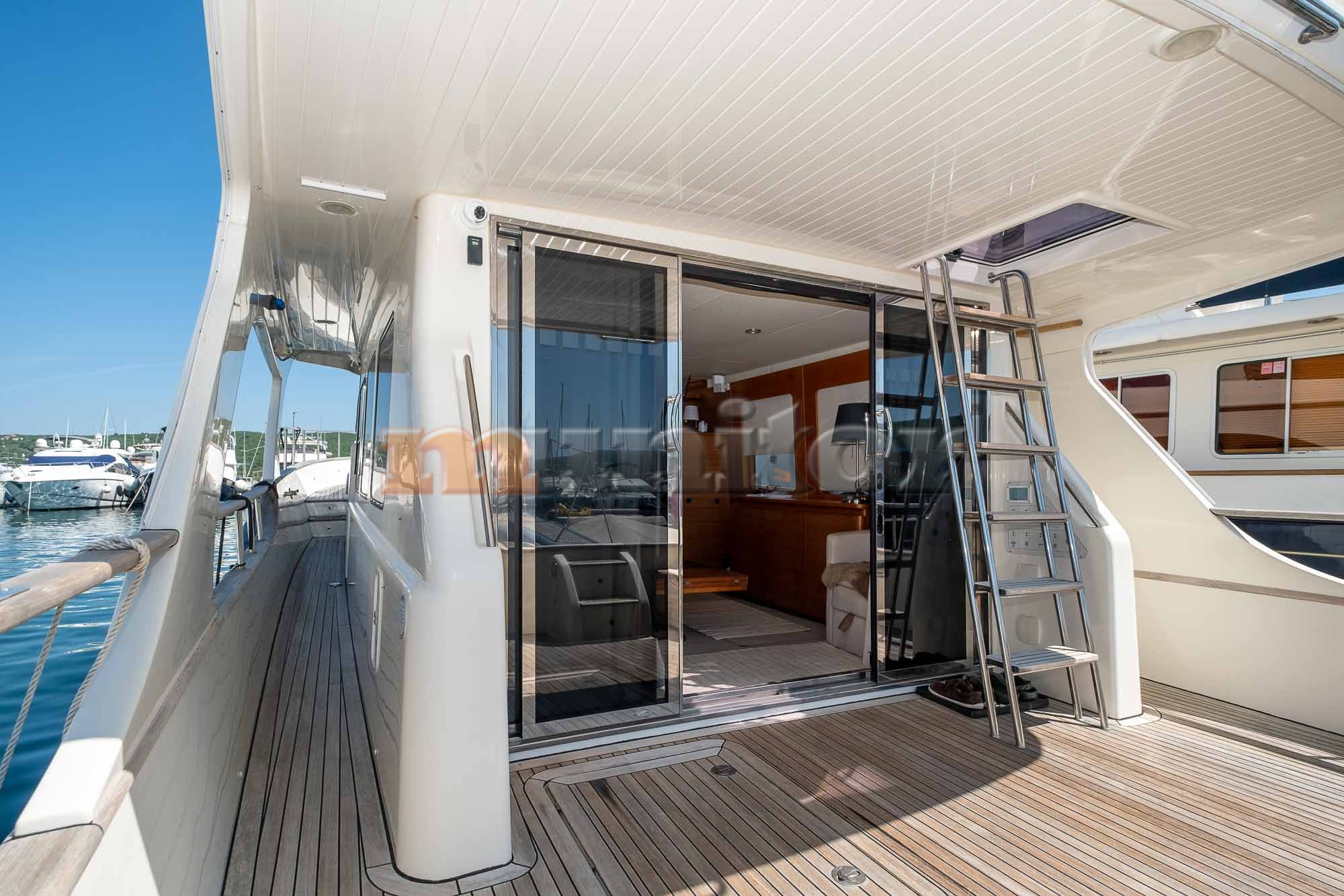 VHF, Echo sounder, Air condition, Heating, Autopilot, Radar, Cockpit shower, El.anchor windlass, Hot water system, Grey water tank, GPS Plotter, Battery charger, FLYBRIDGE Bimini, Deck cushions, Hydraulic gangway, Bow thruster, Audio System, Fenders, Microwave, Compass, Swimming ladder, Side exit door, Generator, Hydraulic bathing platform, El. toilet, Service battery, Engine battery, Teak in cockpit, Stern teak