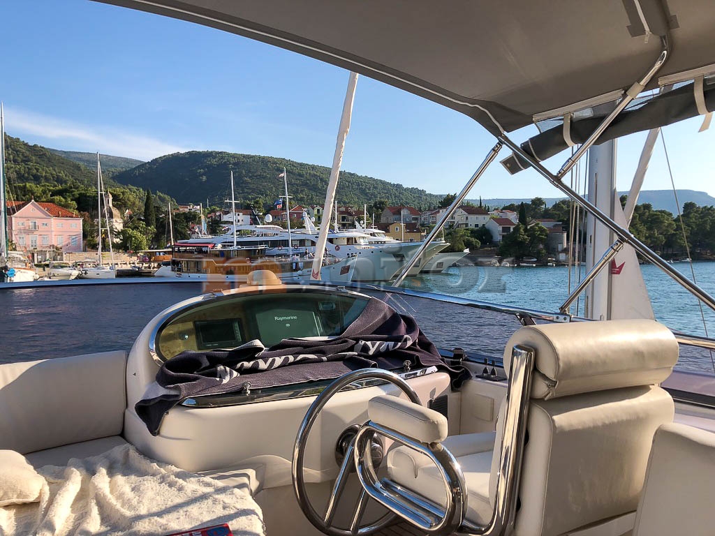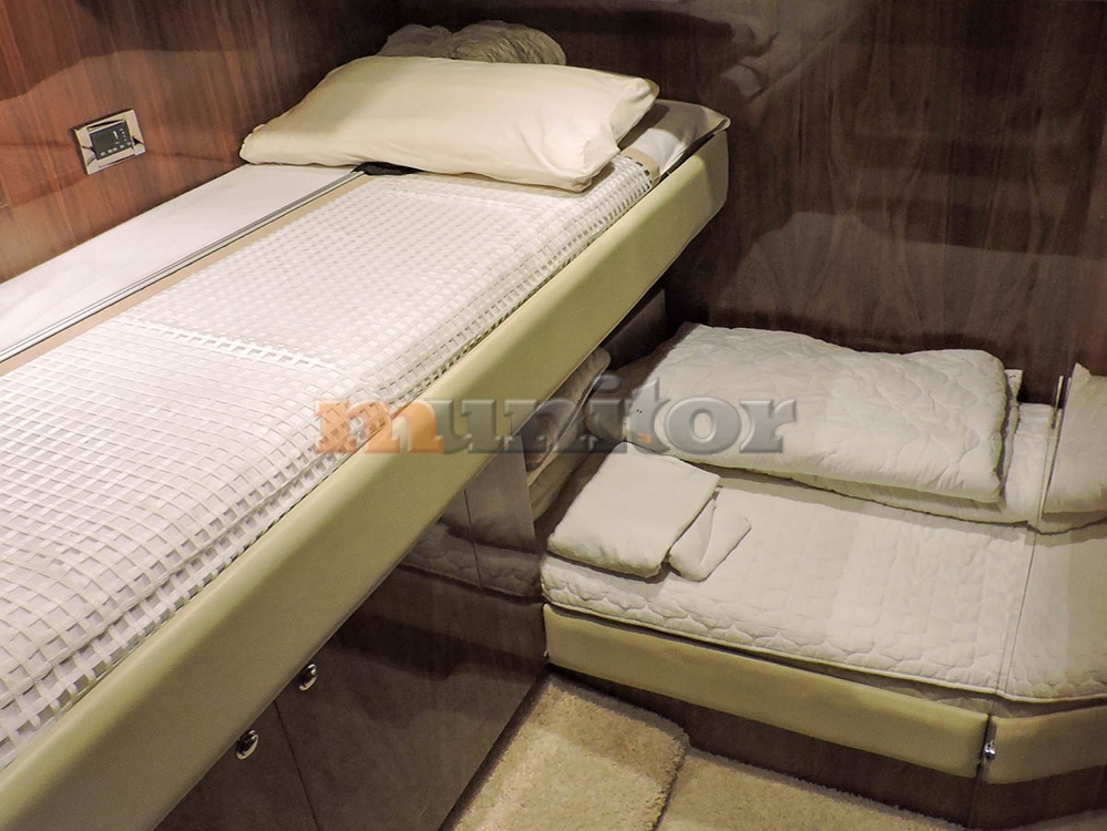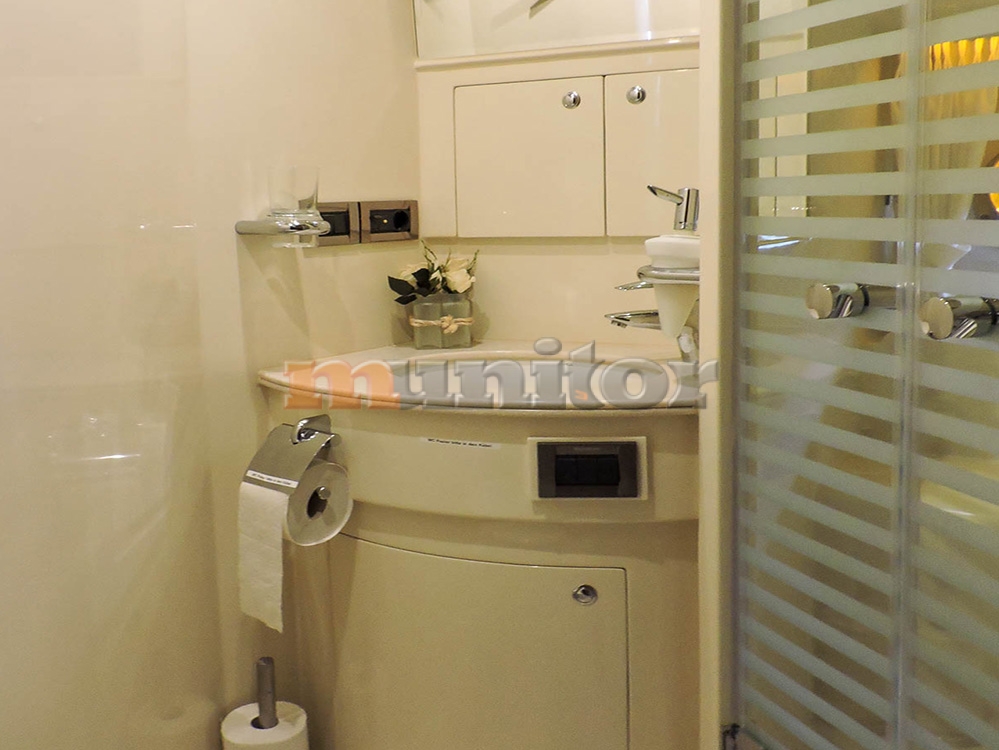 VHF, Echo sounder, Air condition, Heating, Autopilot, Radar, Cockpit shower, El.anchor windlass, Hot water system, Grey water tank, GPS Plotter - RAYMARINE, Battery charger, Deck cushions, Hydraulic gangway, Bow thruster, LCD TV, SAT anten, Audio System, Fenders, Microwave, Bathing platform, Swimming ladder, Sofas in leather, Generator, Washing/ drying mashine, Inverter, El. throttle control, El. toilet, Underwater transom lights, Flaybridge cover, Washer & Dryer, Service battery, Engine battery, Teak in cockpit, Stern teak