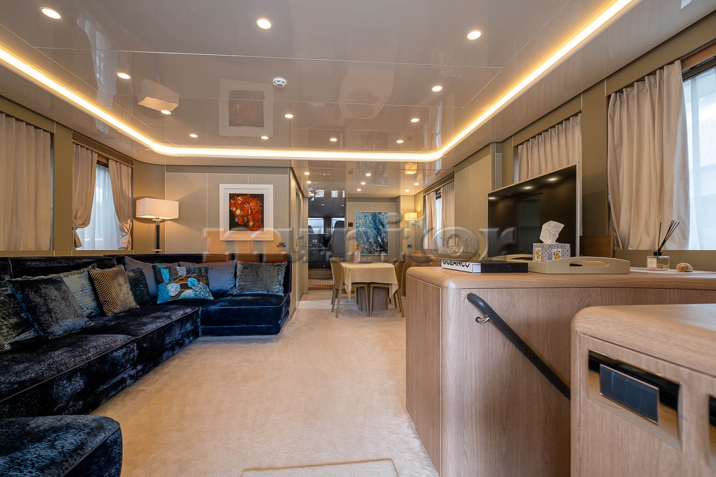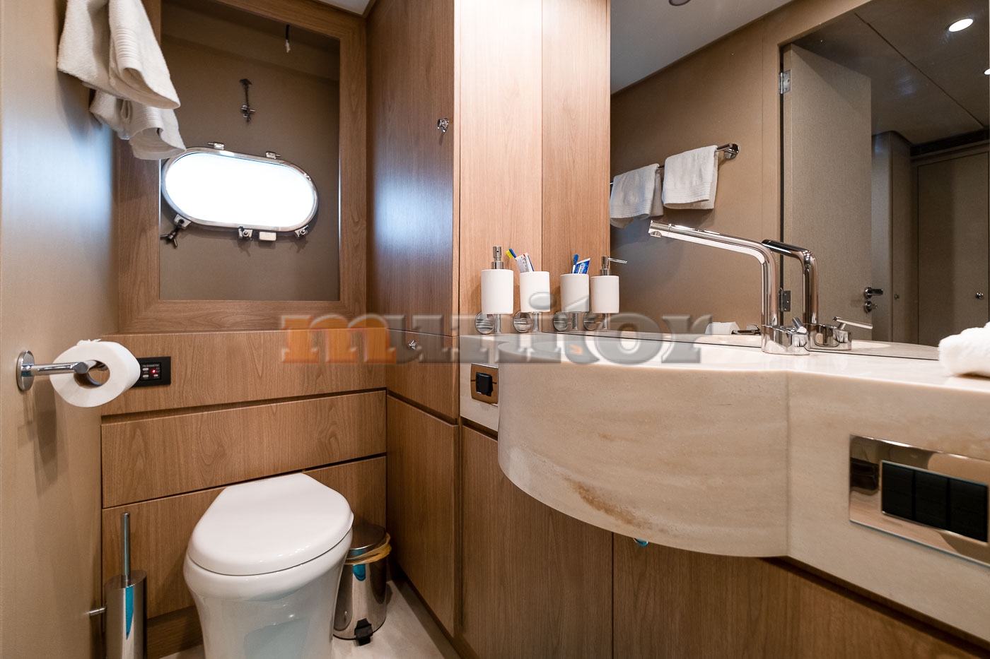 Saloon, Galley, Dinette, FWD cabin, AFT cabin, 2x side cabin, Crew cabin, 4x bathroom, 4x toilet, Cockpit, Flybridge
