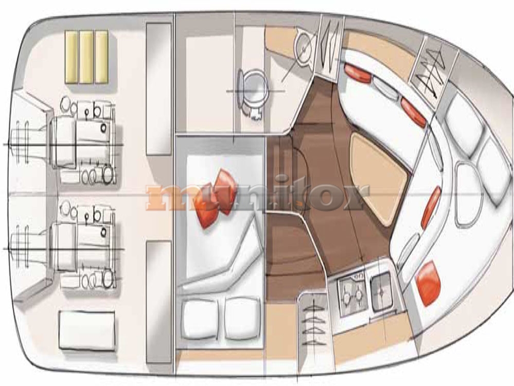 Saloon, Galley, FWD cabin, AFT cabin, Bathroom, Toilet, Cockpit