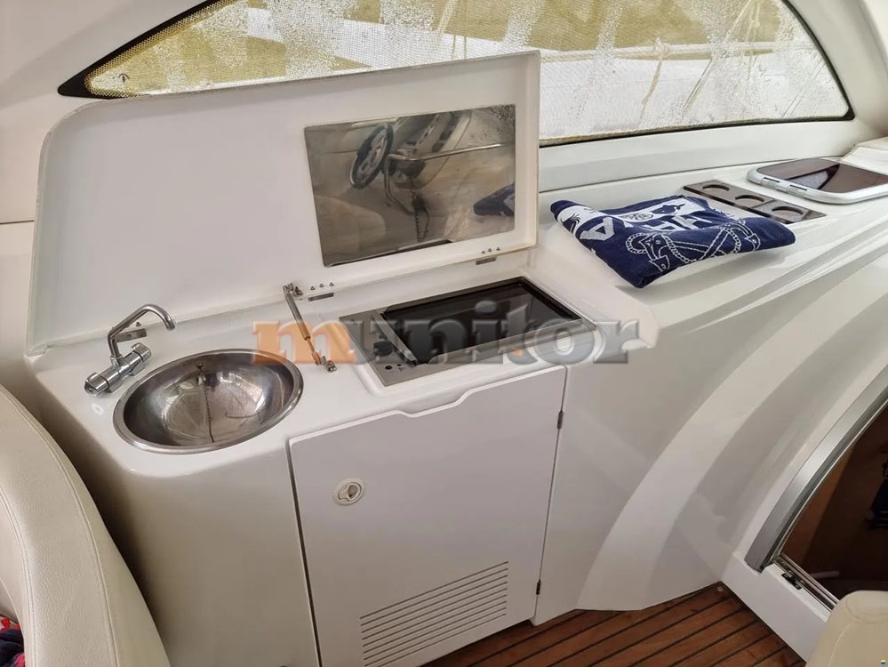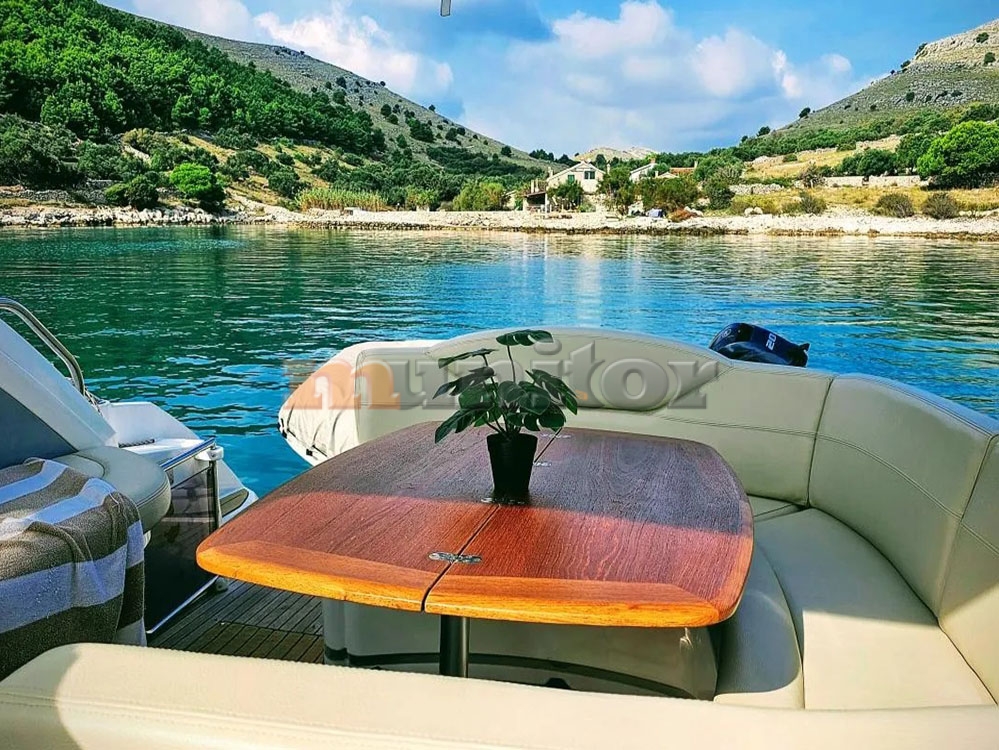 VHF, Echo sounder, Air condition, Heating, Cockpit shower, El.anchor windlass, Hot water system, Grey water tank - 50 lit., GPS Plotter - RAYMARINE, Battery charger, Deck cushions, Audio System, Fenders, Swimming ladder, Hard Top, Service battery, Engine battery, Teak in cockpit, Stern teak, Hydraulic bathing platform, Radar, Bow thruster, Microwave, Underwater transom lights, LCD TV, Grey water tank