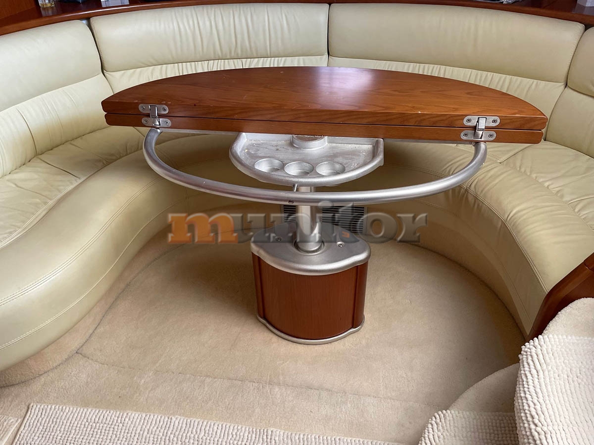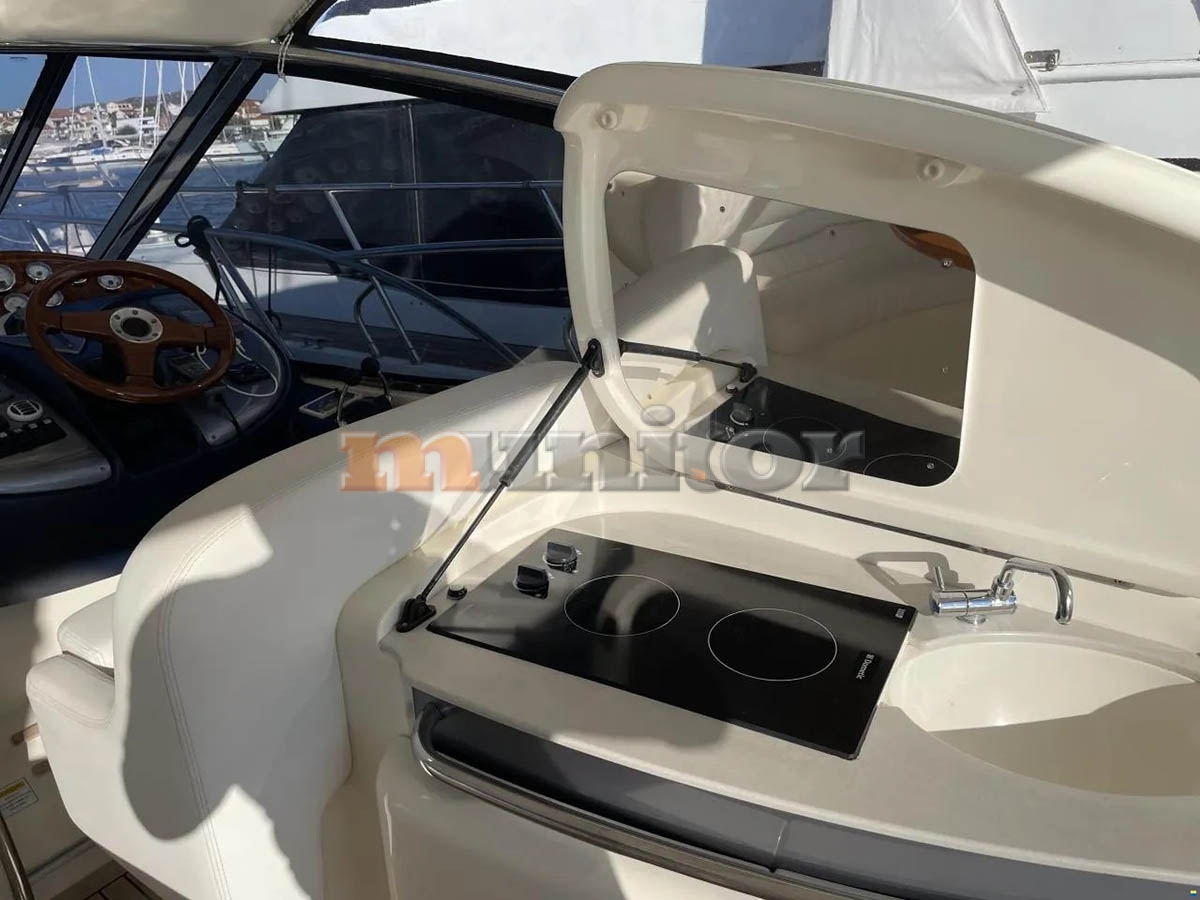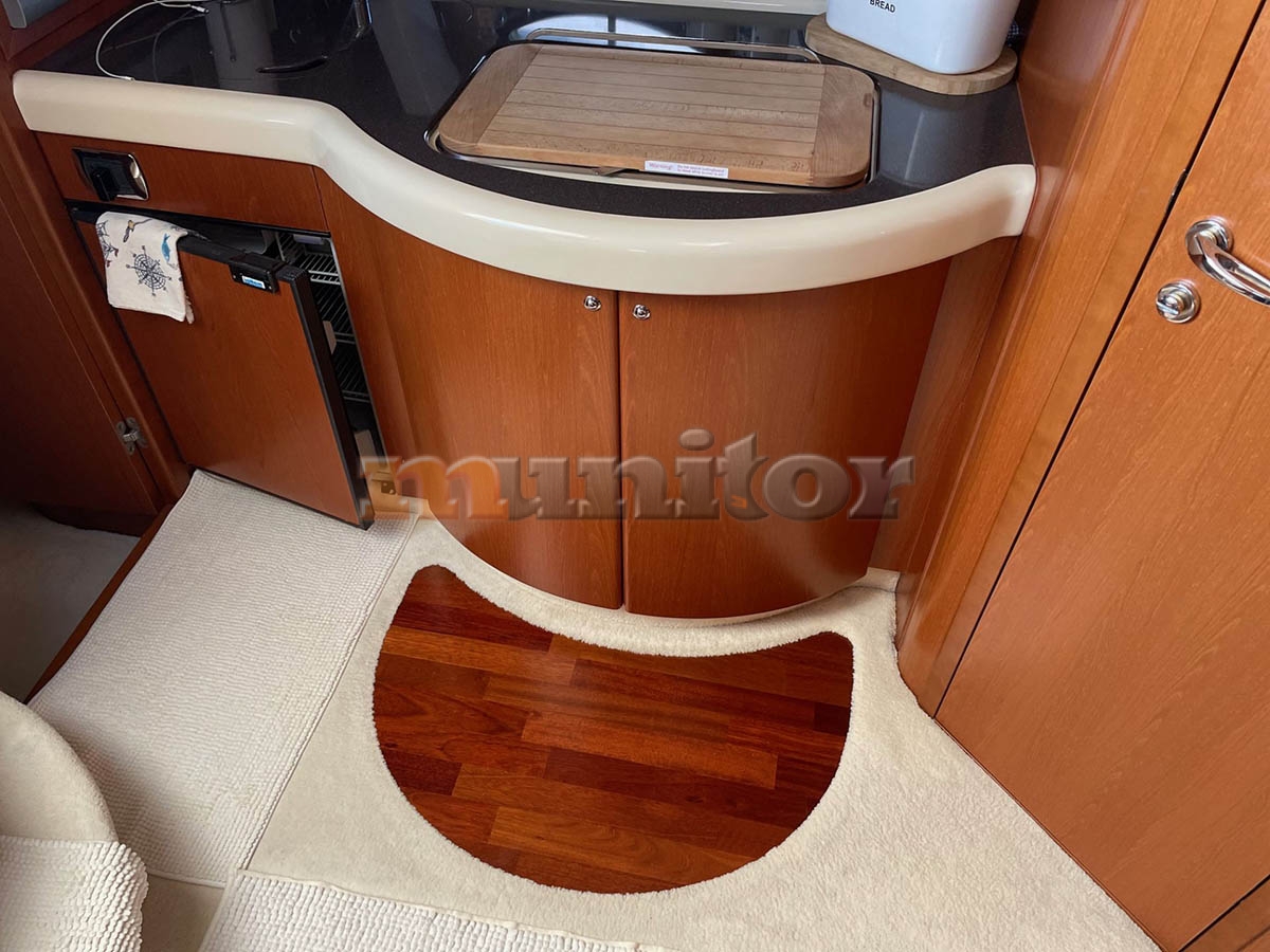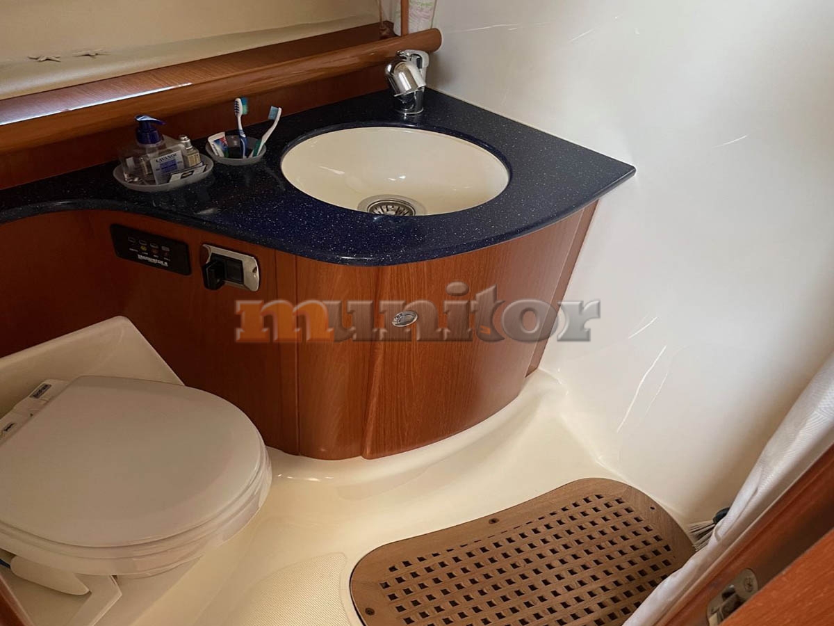 VHF, Echo sounder, Air condition, Heating, Autopilot, Cockpit shower, El.anchor windlass, Hot water system, Grey water tank, GPS Plotter, Battery charger, Deck cushions, Hydraulic gangway, Bow thruster, LCD TV, Audio System, Fenders, Microwave, Bathing platform, Swimming ladder, Sofas in leather, Generator, El. throttle control, Hard Top, El. toilet, Teak in cockpit, Stern teak