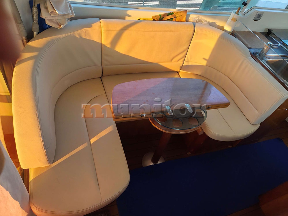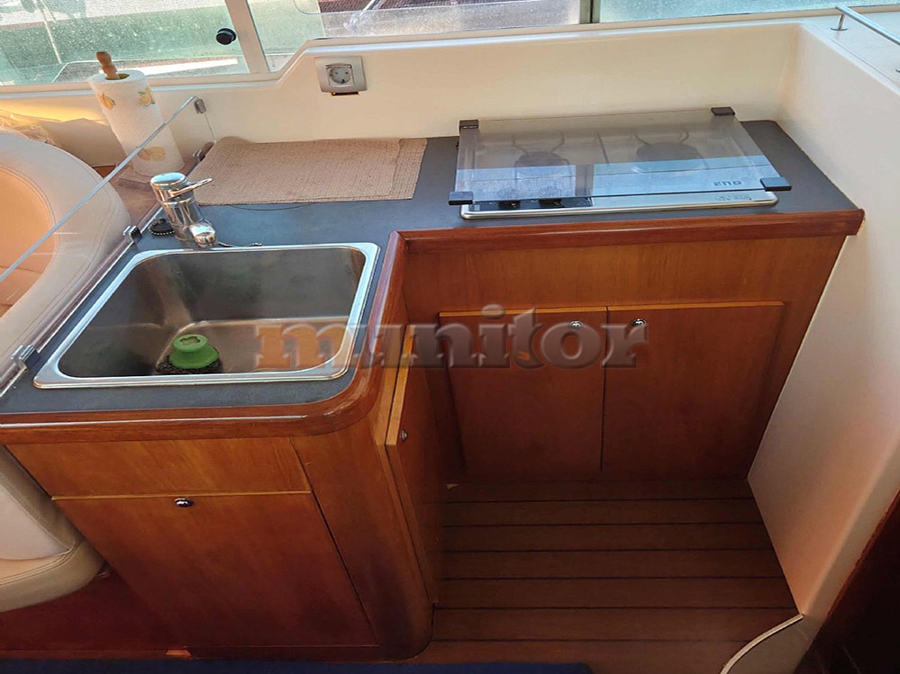 VHF, Echo sounder, Autopilot, Radar, Cockpit shower, El.anchor windlass, Hot water system, GPS Plotter, Battery charger, FLYBRIDGE Bimini, Deck cushions, Bow thruster, LCD TV, Fenders, Compass, Bathing platform, Swimming ladder, Sofas in leather, El. throttle control, Fishfinder, Solar cells, Service battery, Engine battery, Stern teak