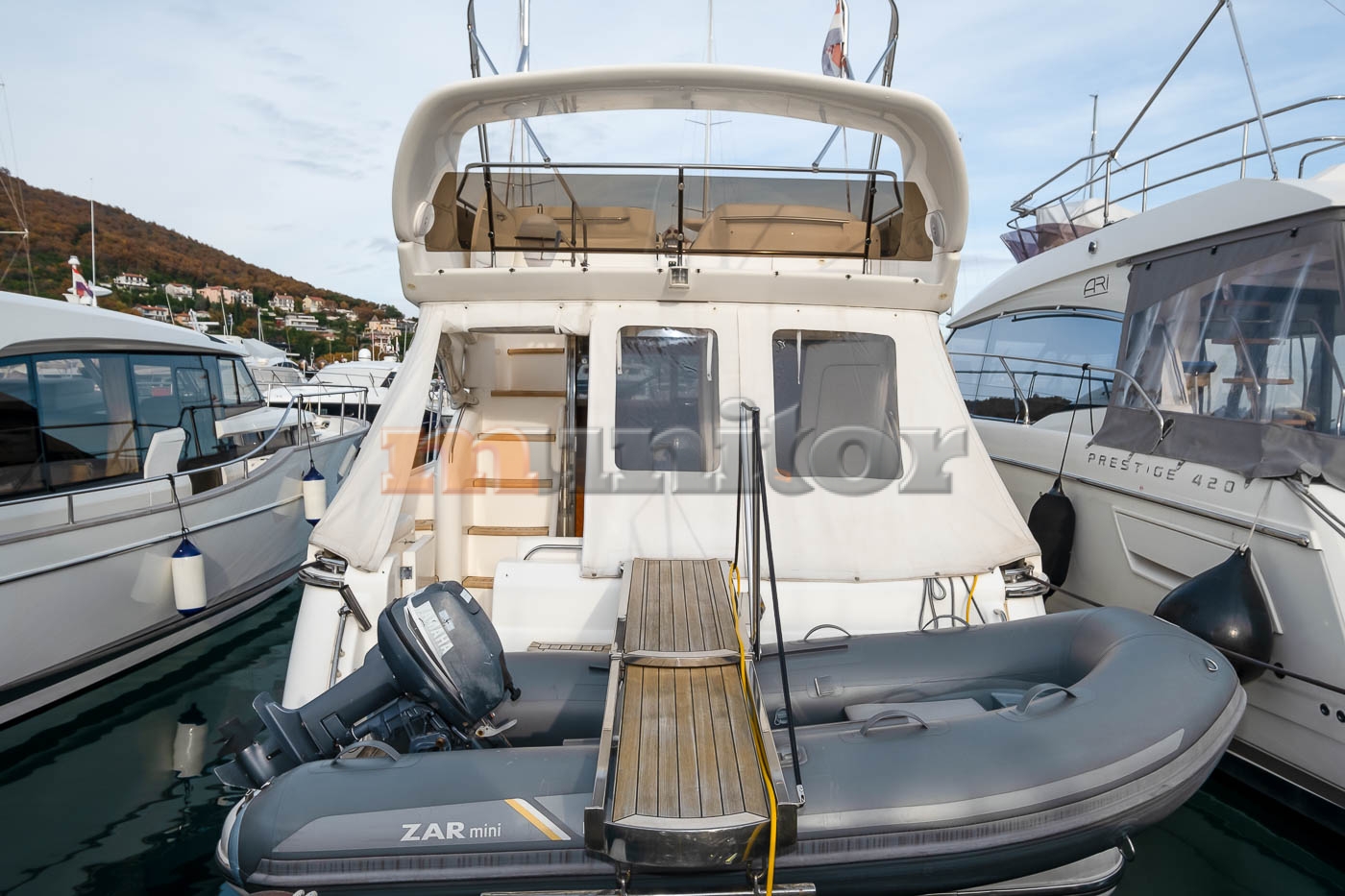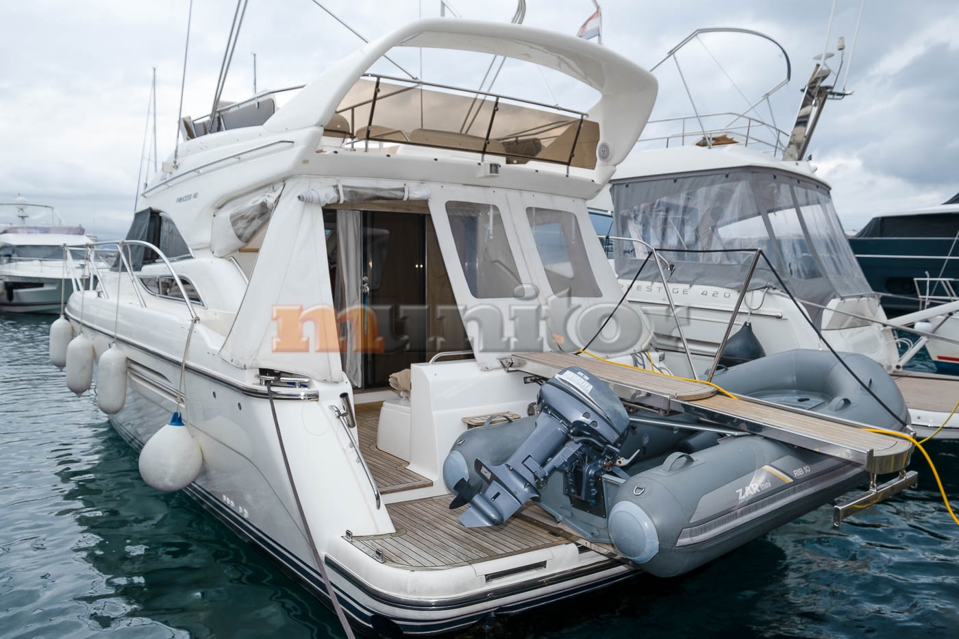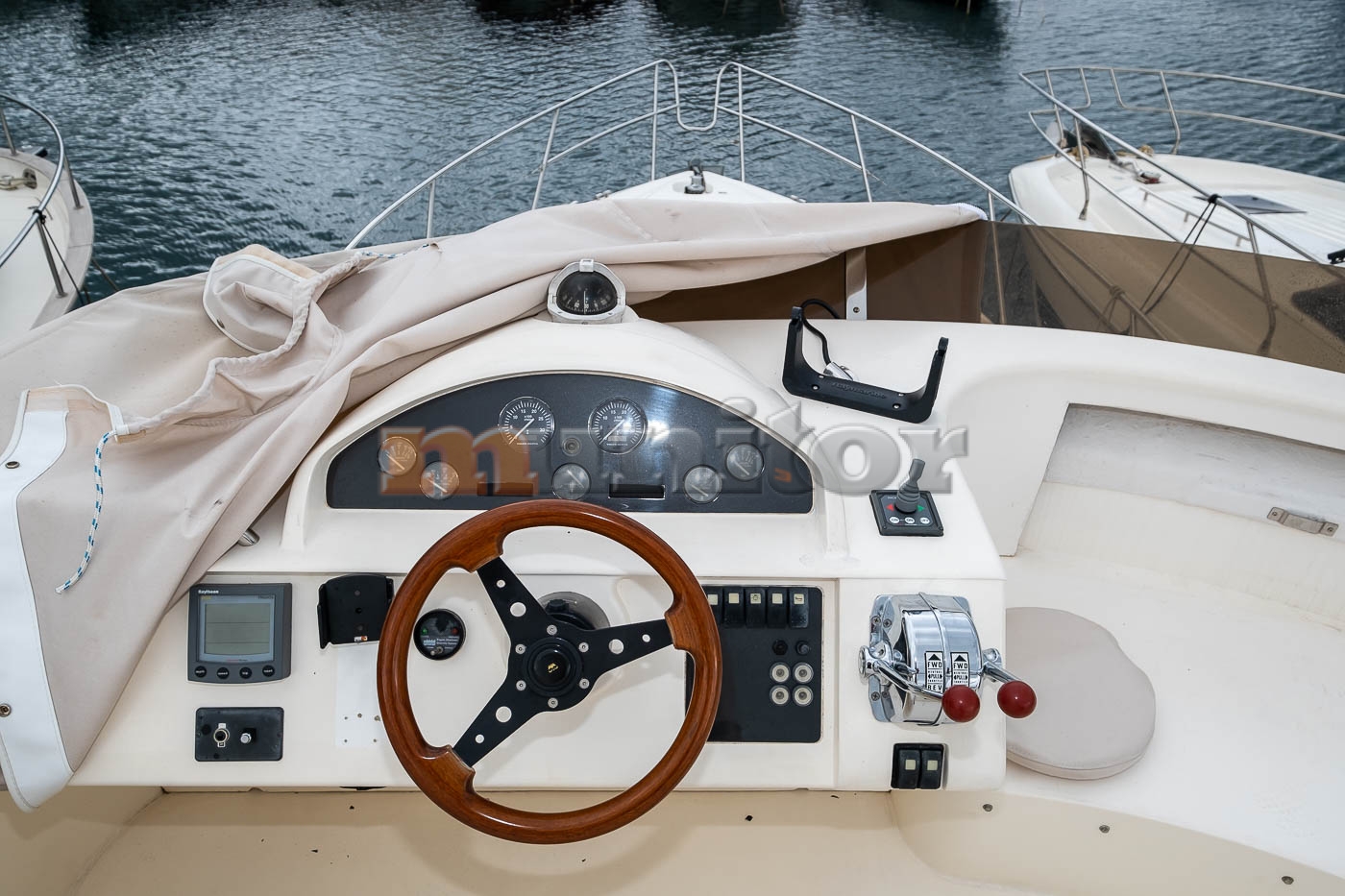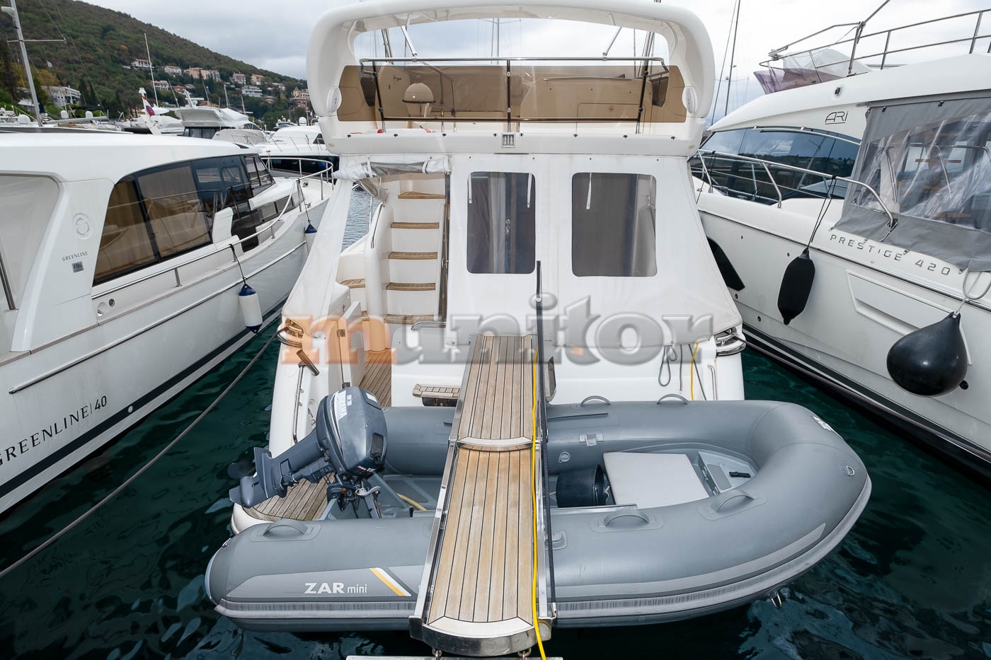 Bathing platform, Battery charger, Bow thruster, Cockpit shower, Deck cushions, Dinghy, Echo sounder, El.anchor windlass, Engine battery, Fenders, FLYBRIDGE Bimini, Generator, GPS Plotter, Grey water tank, Hot water system, Hydraulic gangway, Microwave, Outboard motor, Service battery, Stern teak, Swimming ladder, Teak in cockpit