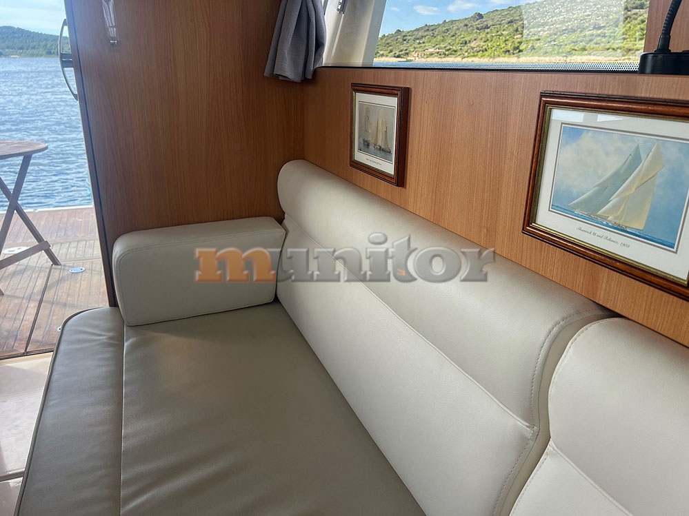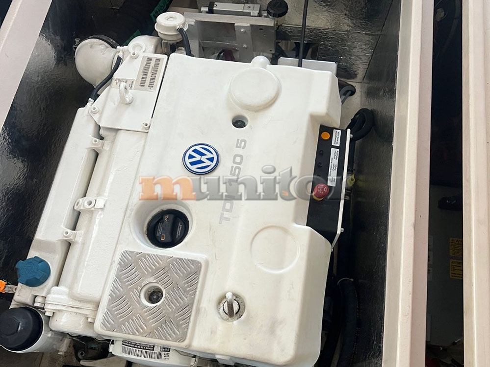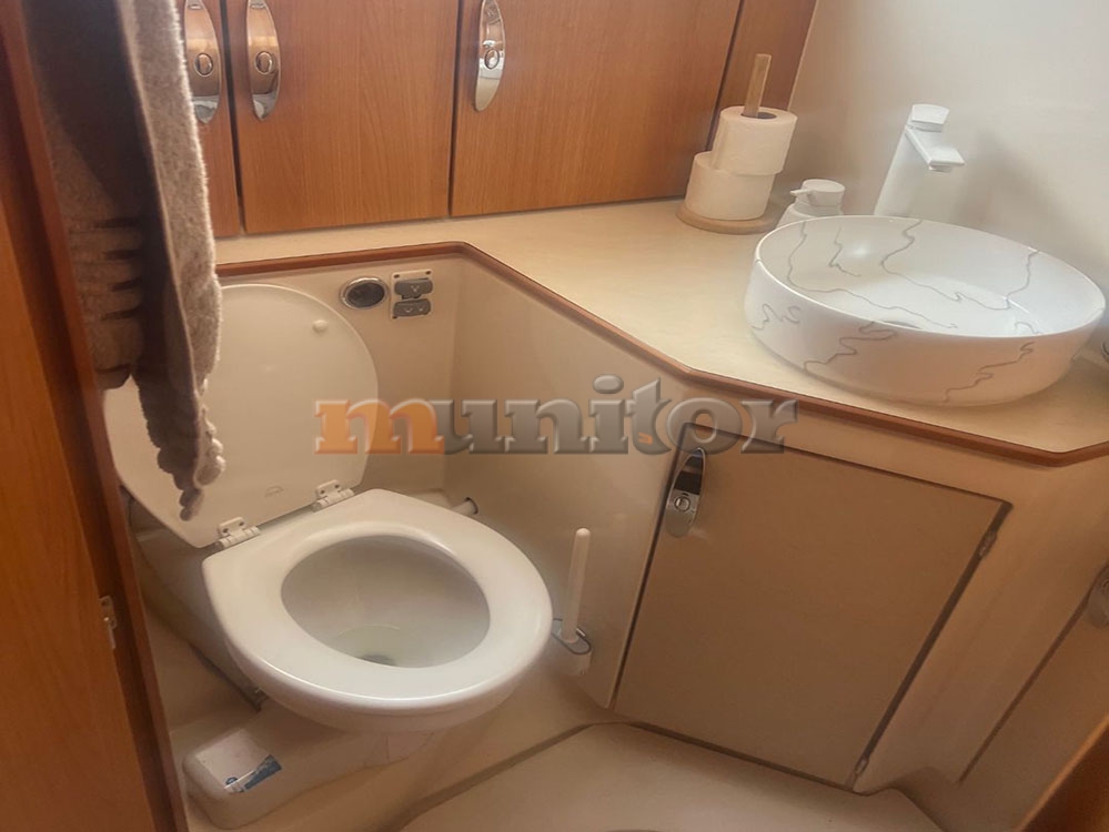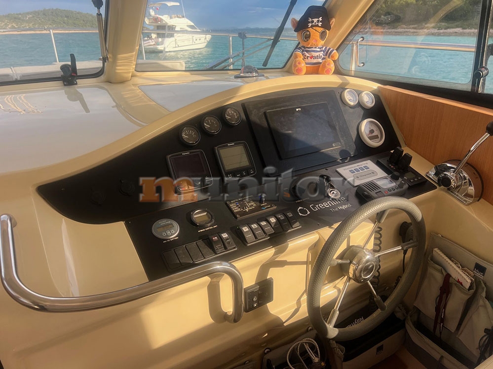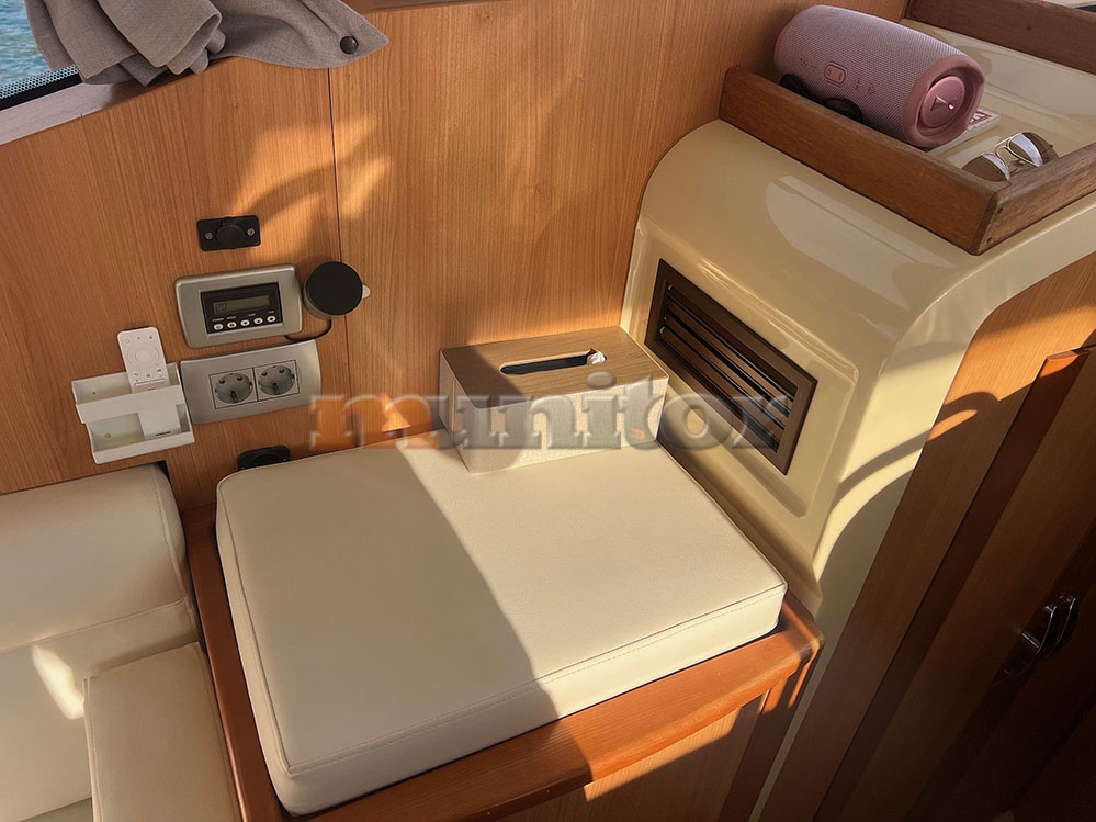 VHF, Echo sounder, Air condition, Heating, Autopilot, Cockpit shower, El.anchor windlass, Hot water system, Grey water tank, GPS Plotter, Battery charger, Bow thruster, Stern thruster, LCD TV, Audio System, Fenders, Compass, Bathing platform, Swimming ladder, Sofas in leather, Hard Top, Solar cells, Service battery, Engine battery, Teak in cockpit, Stern teak, El. toilet