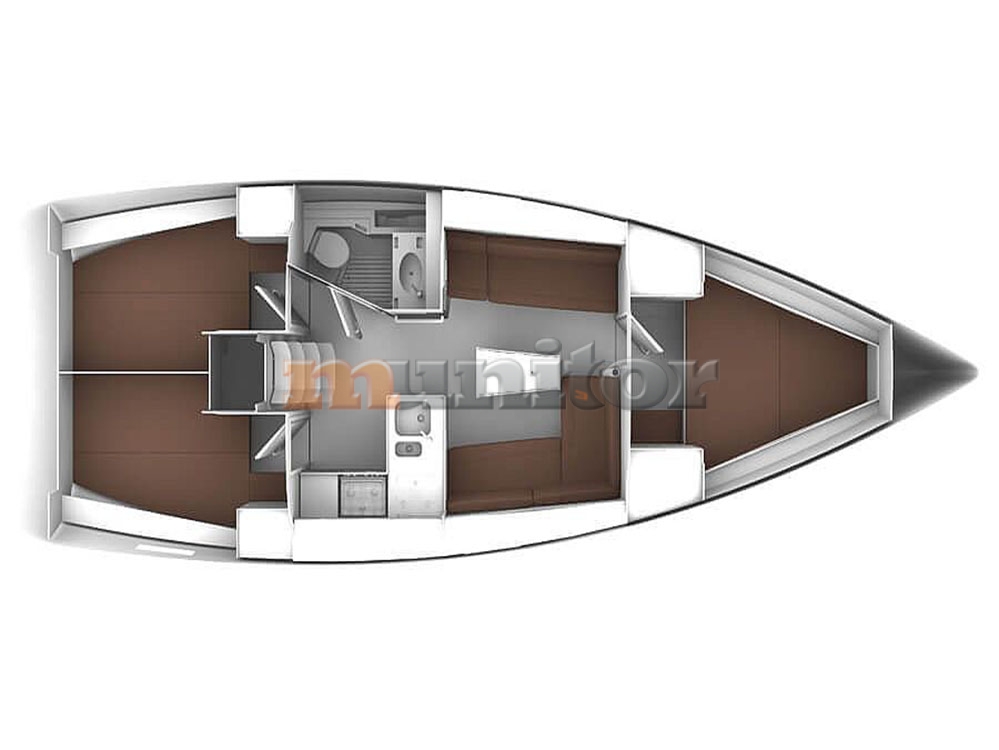 Saloon, Galley, FWD cabin, 2x AFT cabin, Bathroom, Toilet, Cockpit