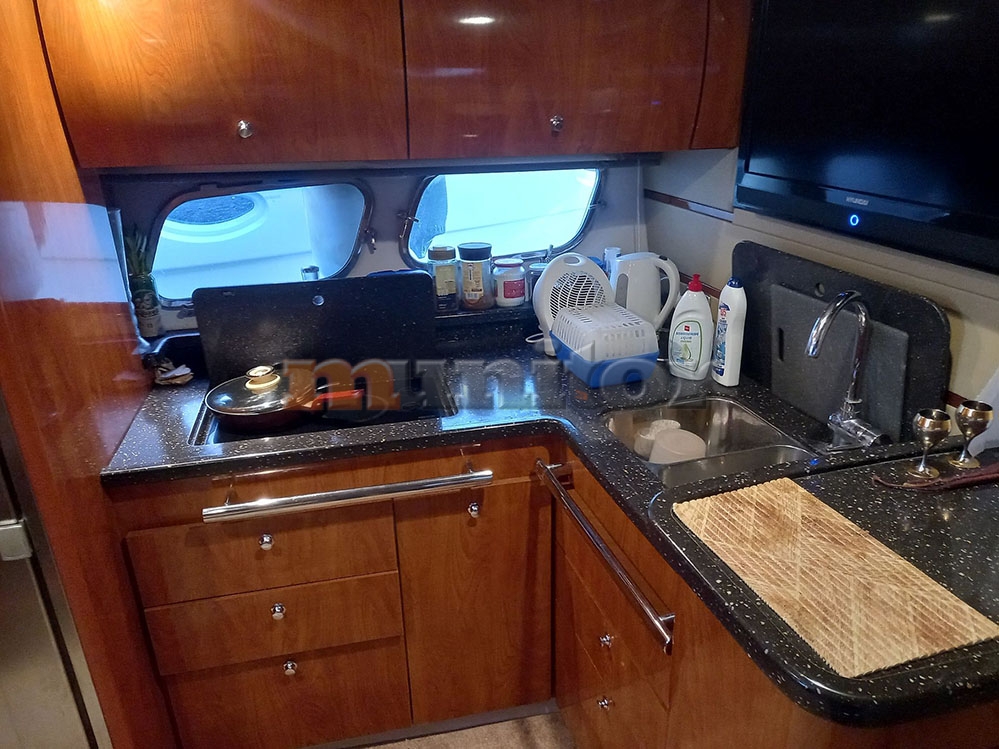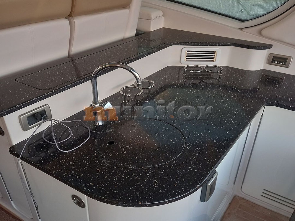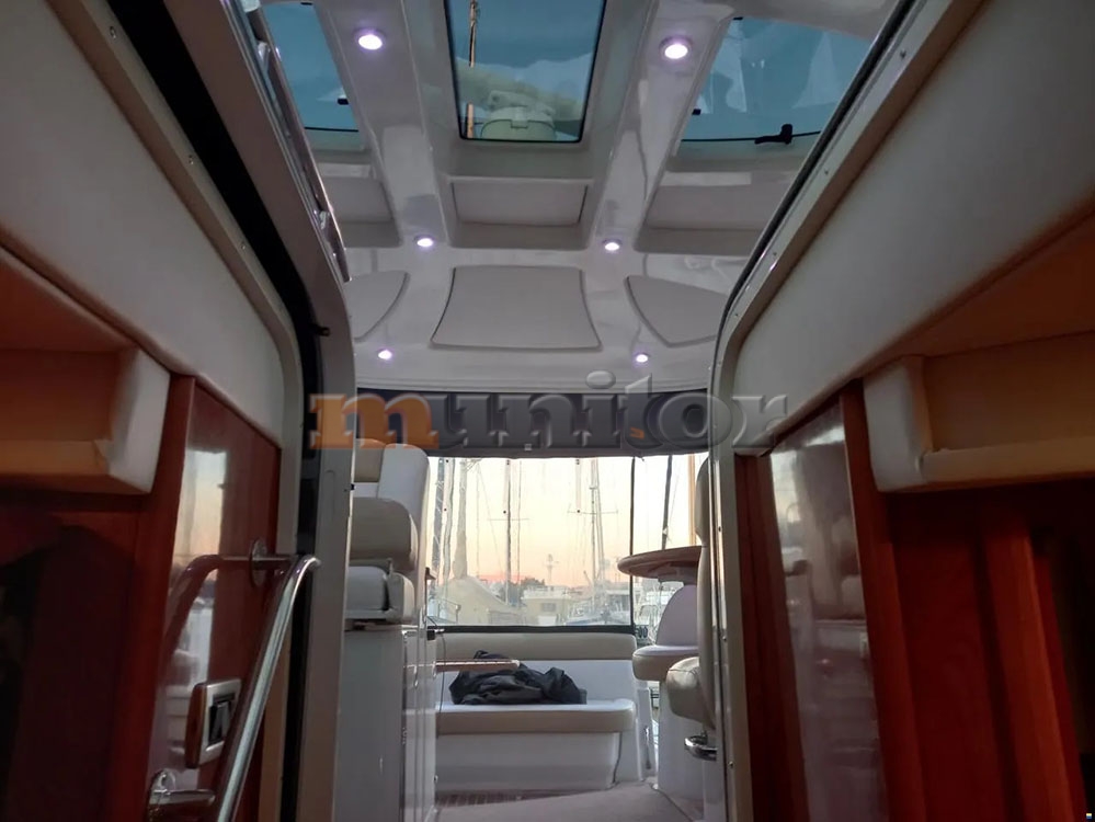 VHF, Echo sounder, Air condition, Heating, Autopilot, Radar, Cockpit shower, El.anchor windlass, Hot water system, Grey water tank, GPS Plotter, Battery charger, Deck cushions, Bow thruster, LCD TV, SAT anten, Audio System, Fenders, Microwave, Swimming ladder, Sofas in leather, Generator, Washing mashine, El. throttle control, Hard Top, Hydraulic bathing platform, Joystick control, El. toilet, BOSE - stereo system, Service battery, Engine battery, Teak in cockpit, Stern teak