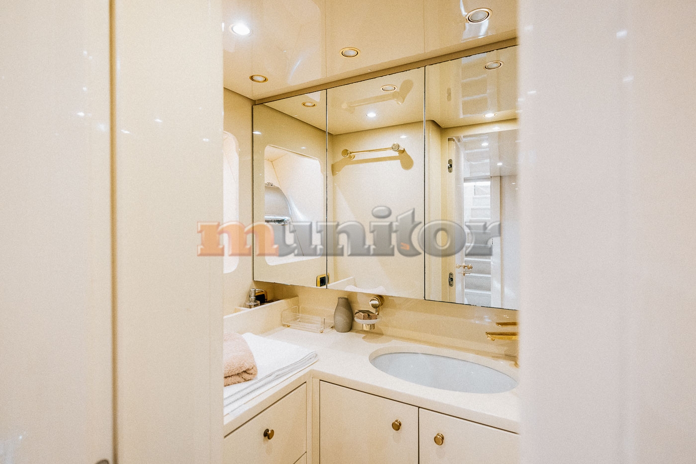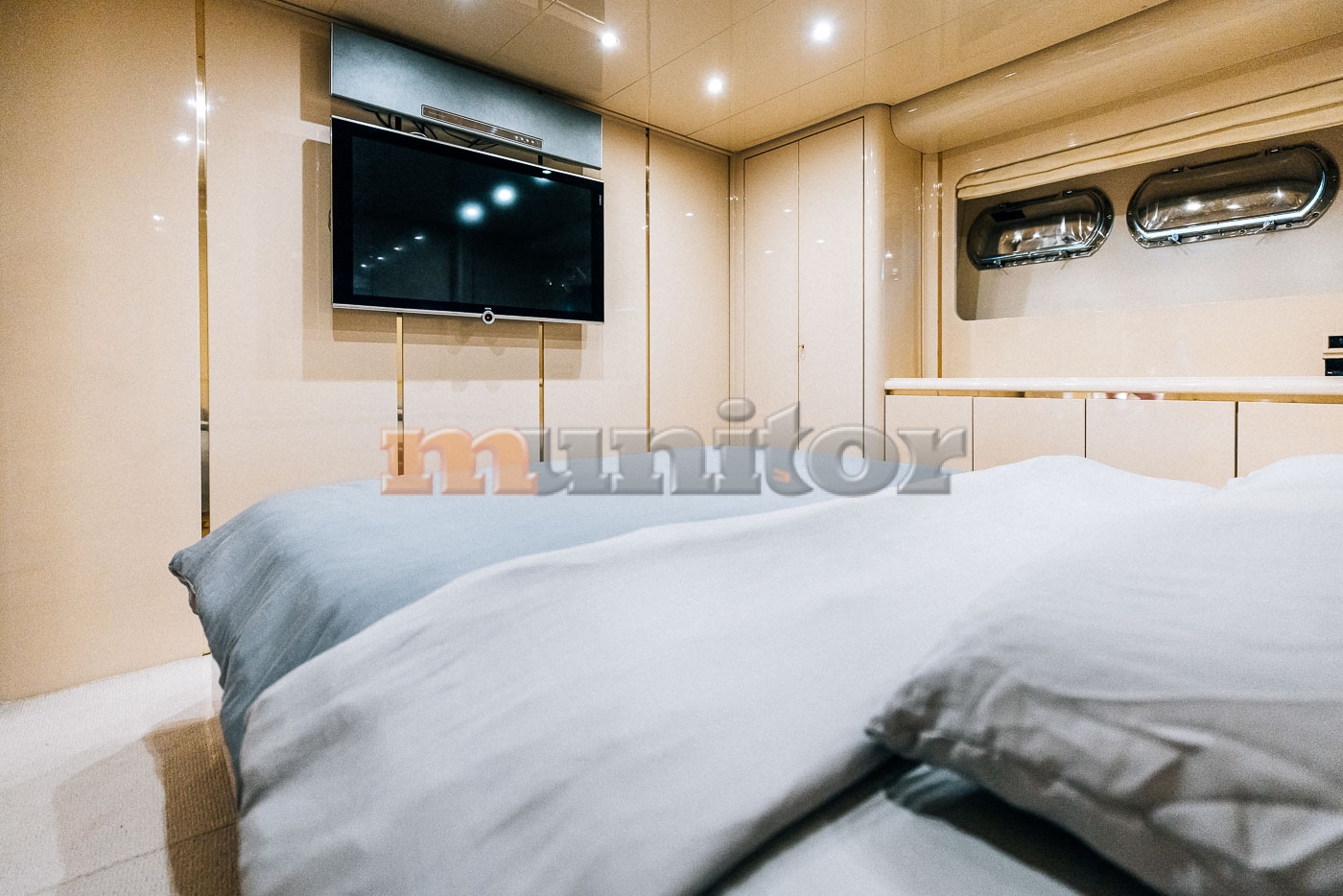 Radio stanica, Dubinomjer, Krmeni tuš, El.sidro, Topla voda, Tank za fekalije, GPS Ploter, Punjač baterija, Jastuci za sunčanje, Prednji pramčani propeler, LCD TV, Audio System, Bokobrani, Mikrovalna pećnica, Ljestve za kupanje, Servisna baterija, Motorna baterija, Hladnjak, Flapsovi, Klima uređaj, Grijanje, Autopilot, Radar, Splav za spašavanje, Prsluci za spašavanje, Hidraulična pasarela, Zadnji krmeni propeler, SAT antena, Kompas, Ledomat, Bočna vrata, Generator, Perilica za veš, Perilica za suđe, Hard Top, Hidraulična platforma za kupanje, Tikovina u kokpitu, Tikovina na krmi, Tank za sive vode
